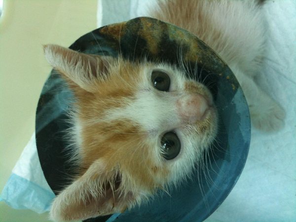 隔天到醫院的加護病房去看小貓,小貓的床友是一隻大大貓,但他會在加護病房。也應該算是生病的大大貓。大大貓不斷的叫著,只見小貓精神算是不錯的看著我,小貓帶著超級可愛的伊利沙白項圈,因為他的腳還打著點滴中。小貓看到我,海開心的叫著,似乎他也告訴我請我不用擔心,他會努力的活下去!看到小貓友那麼強的求生意志,心情也相當的開心。接下來幾乎每天都有去看小貓,就醫院的人員形容小貓的吃相是 “餓死鬼”,哈哈,我想那是形容他吃的相當的多,,哈哈,真好,能吃才有體力面對接下來的截肢手術呀!黃醫生對他的吃喝情況也相當的滿意,也向我解釋了開刀的時間還未確定,原因是小貓太小了,如果不等他大些或恢復的好些,血管也過於細小,一但麻藥下去,劑量沒抓好的話,小貓很容易就會一命嗚呼的。於是聽從黃醫生的指示,讓小貓多待幾天。之後過幾天,小貓的點滴已經取下,他一且已經恢復正常吃喝,真是了不起,黃醫生說他的情況相當的好,過幾天就可以動手術了。於是我們靜靜的等著那天的到來。
